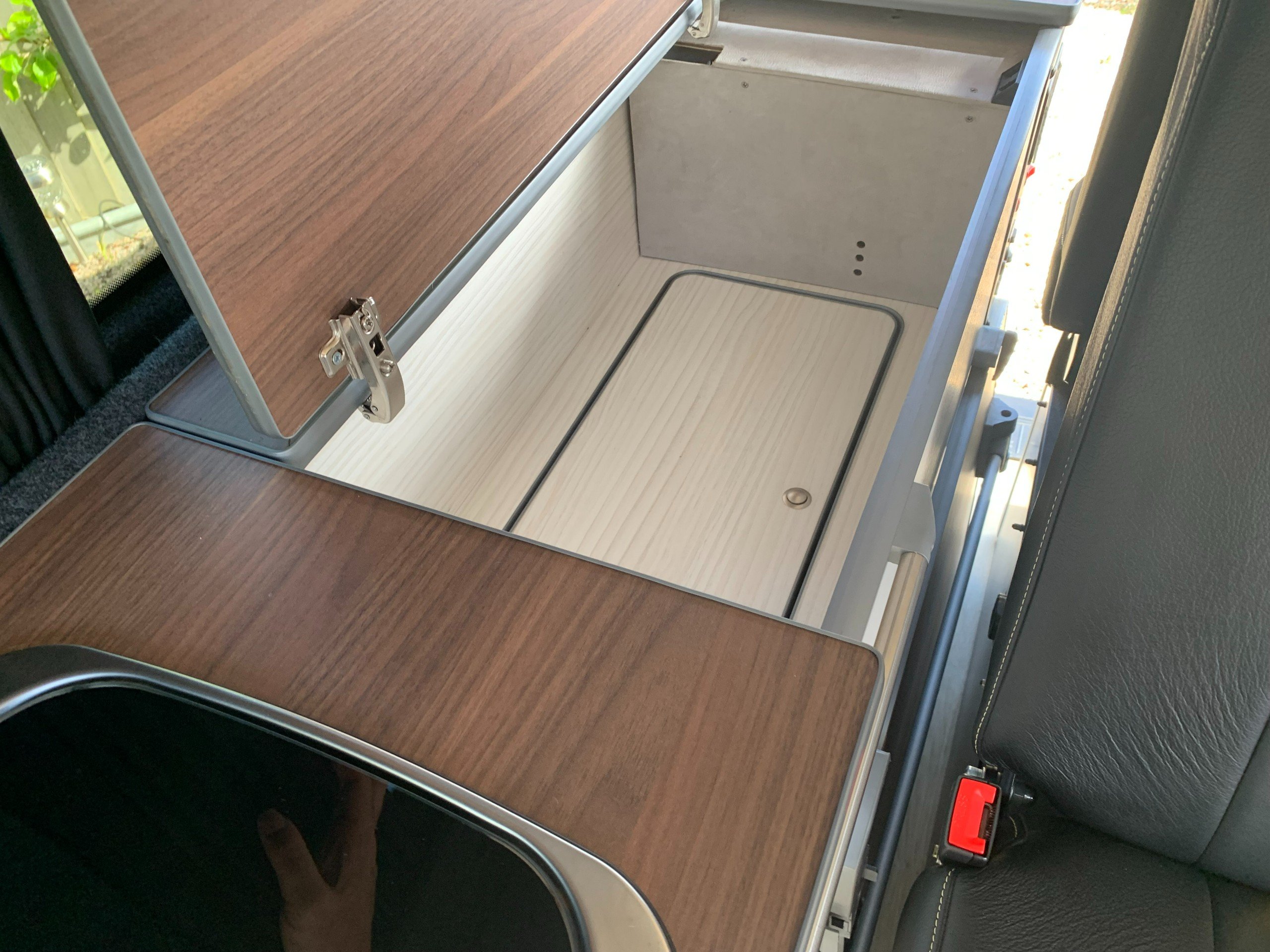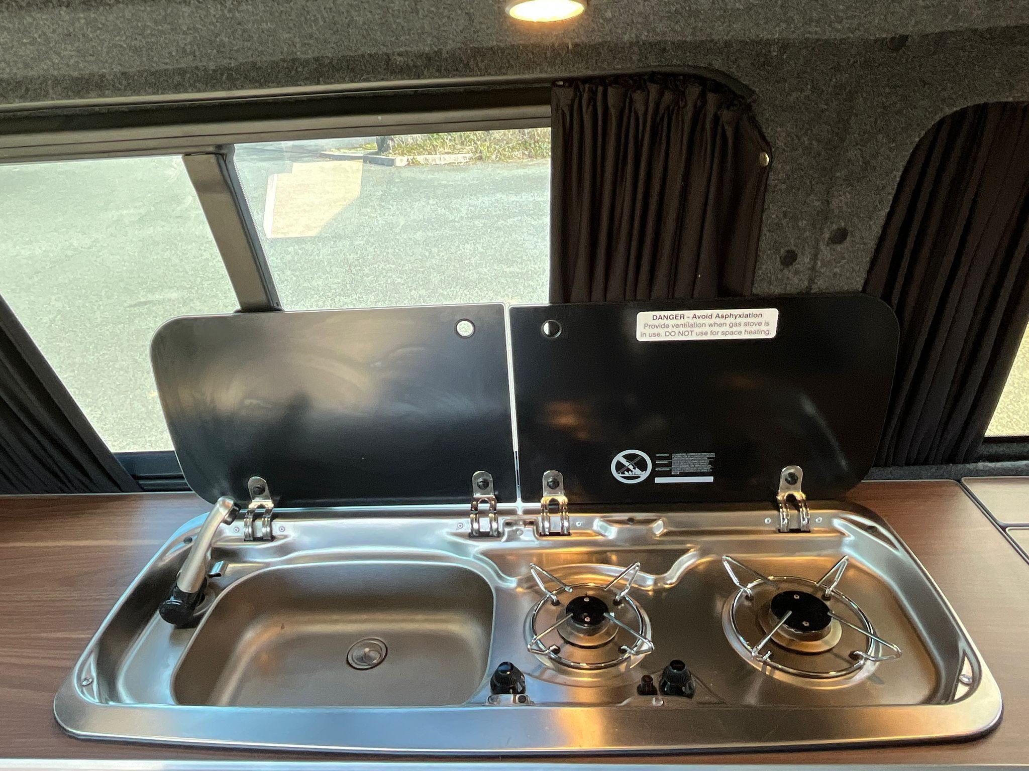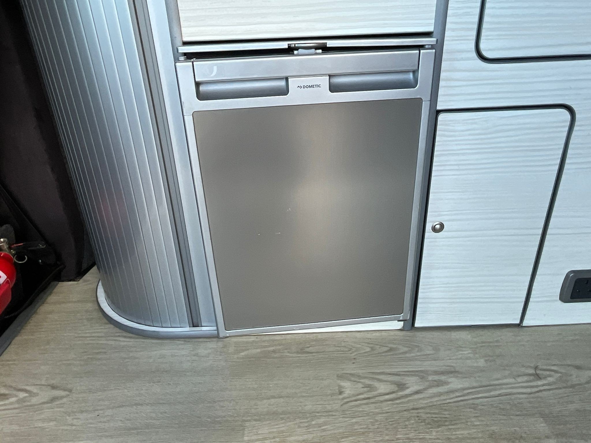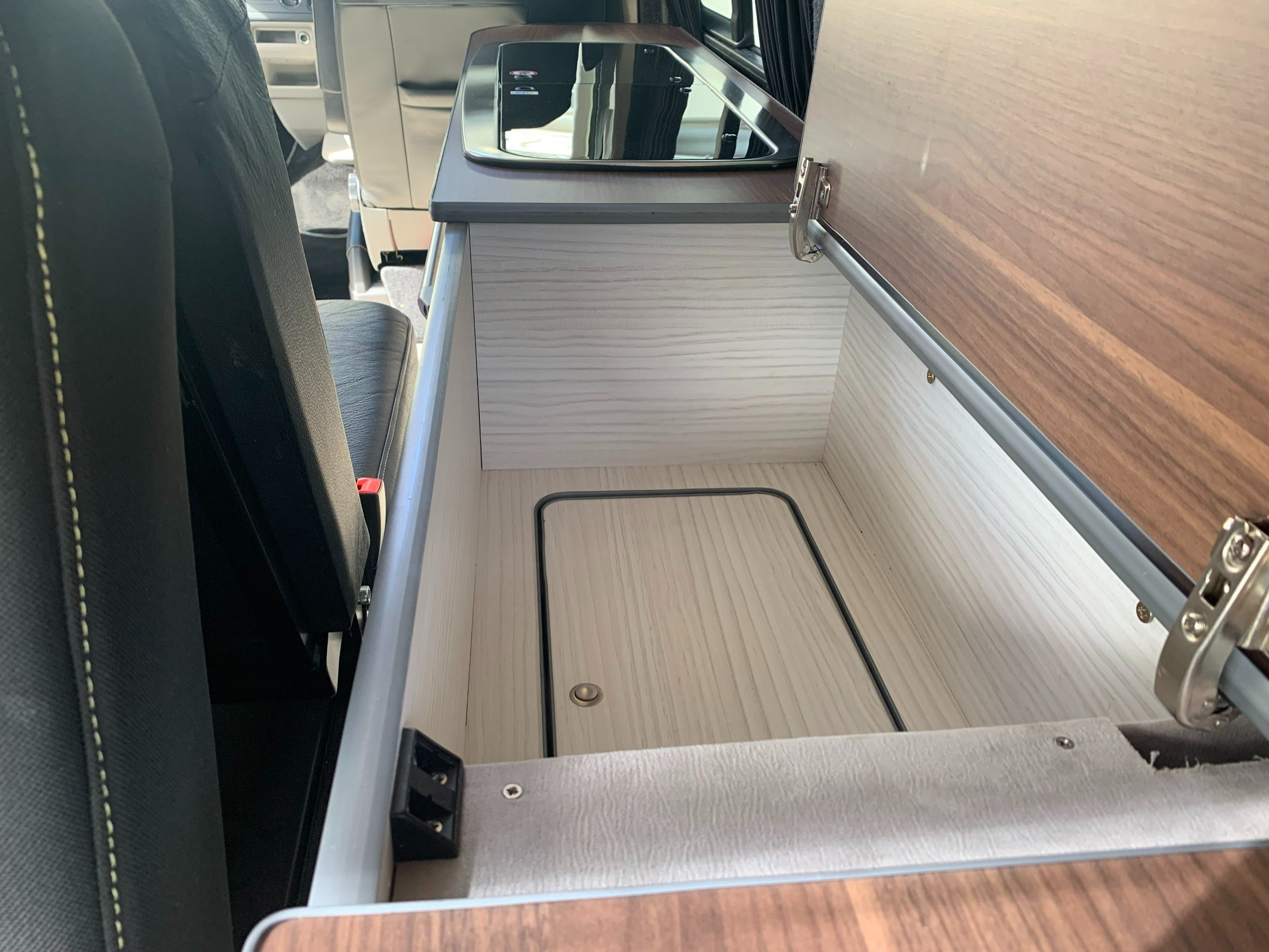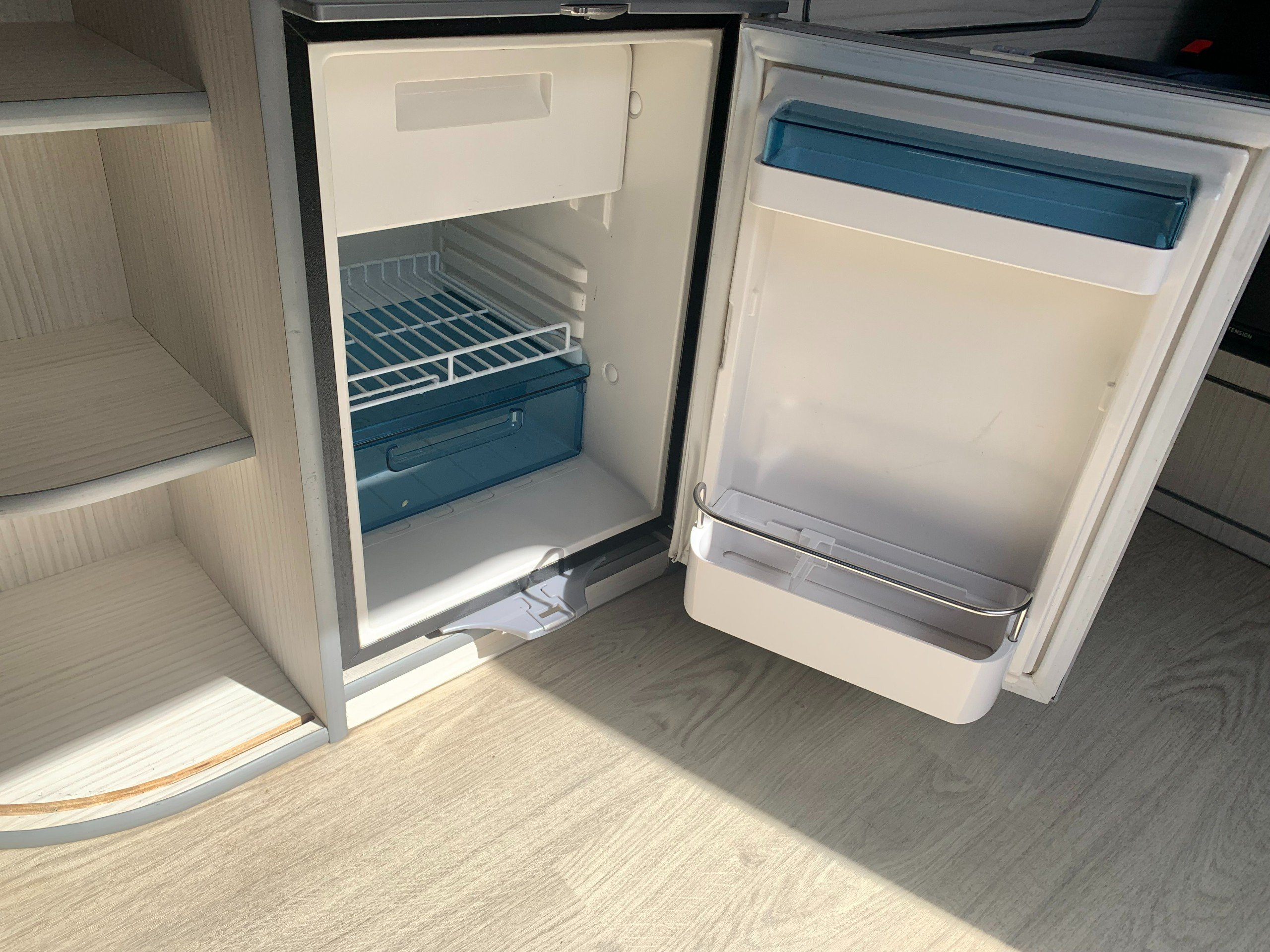 The popular side kitchen layout with quality rock and roll bed, this effortlessly converts, with additional sleeping above in the Elevating roof. Two Burner Hob, and Fridge Freezer.